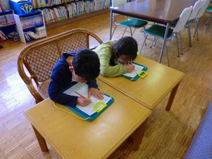 2年生は生活科の学習で、学校探検の準備をしていました。近々1年生に学校を案内することになっているので、その下準備です。どこをどうやって紹介するのか、場所を確認したり紹介する内容を考えたりと、やることがたくさんあります。すっかり先輩の2年生ですが、1年生をどのように案内するのか、とても楽しみです。