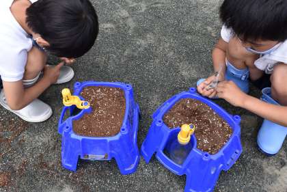 第一関節まで穴を空け、やさしく包み込み、最後はふりかけのように肥料をまきました。
