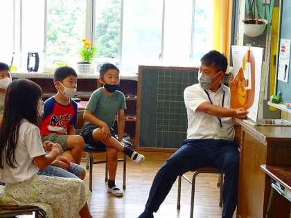 週に2・3回、中休み終了後にEET(Enjoy ENglish Time)の時間をとっています。1・2年生の教室を覗いてみましたところ、1年生は果物の名前のチャンツを、2年生は英語の絵本の読み聞かせをしていました。どちらの学年も楽しく英語に触れることができたと思います。
