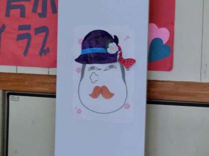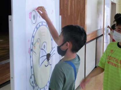 どんなふうになるのかなと楽しみにみていました。上学年と下学年とでペアを組み、目をつむったペアの子を台紙まで誘導してあげて、パーツを貼る。その繰り返しでできあがっていきます。向きや場所がおかしくなってしまい、出来上がりの顔をみんなで楽しみました。思っていたより、ずっと面白い福笑いでした。