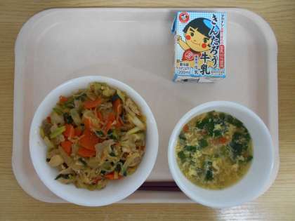 豚肉は江戸時代の初め頃に中国から沖縄県、鹿児島県に伝わり、その後、各地に広まったそうです。今日は豚肉をにんにく・しょうが・人参・玉葱・白滝・小松菜と一緒に炒め、砂糖・塩・こしょう・しょうゆ・豆板醤・オイスターソースで味付けし、麦ご飯の上にのせて豚肉小松菜丼にしました。