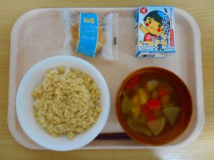 今日の鯛めしは、小田原の海でとれたイシダイがはいった献立です。小田原の漁師さんが、早川漁港から船をだして、定置網でとったものです。その後、魚の加工職人さんが魚をさばいて、今日の朝、片浦小学校に届けてくれました。そして、給食室で蒸した後、こまかくほぐして、調味料とだしを煮立てたところに入れて、30分位いって仕上げました。今日はもうすぐ卒業を迎える6年生のお祝いにイシダイのはいった鯛めしをだしました。