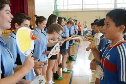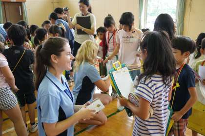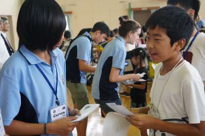 いよいよ交流の始まりです。はじめに、お互いを知り合うために、用意してきた名刺を渡しながら自己紹介をしました。遠慮がちにしていた子どもたちも、マンリーの子たちが先に話しかけてくれたこともあり、進んで自分の好きなことなどを話すことができました。手作りうちわのプレゼントもとても喜んでもらえました。