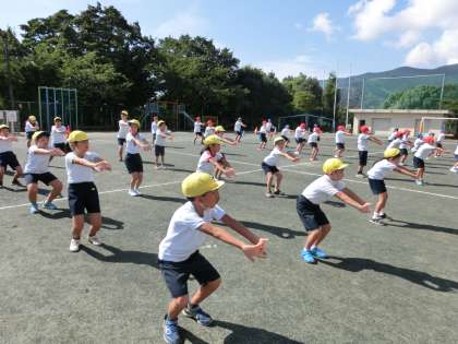 9月13日(水)に、運動会全体練習がありました。入場行進、開閉会式、片浦体操、綱引き、フォークダンスなどの練習を行いました。真夏に戻ったような日でしたが、子どもたちは、暑さに負けずに精一杯練習に取り組んでいました。