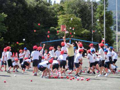 9月19日に、ダンシング玉入れの練習を行いました。今年は、音楽が流れている間は、ピコ太郎のダンスを踊ります。みんな、一生懸命に踊った後に、全力で玉入れに挑戦していました。片浦小の特色ある楽しい種目だと感じました。