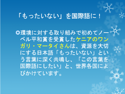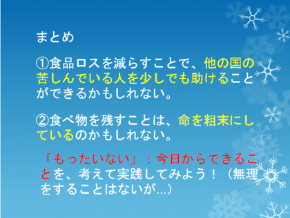 2月5日(月)に朝会がありました。村松校長先生が、日本語の「もったいない」は世界の共通語になっていることをお話してくださいました。世界中では、日本のように食べ物をたくさん捨てている国があること、その一方で、食べ物が不足して困っている人々が世界中にはたくさんいることもお話してくださいました。牛乳は、牛のお母さんが子どもにあげるはずのお乳を人間がいただいていることを例に、生きていくということは、他の生き物の命を「いただく」ということなので、「もったいない」ことはせずに、できる範囲で出された食べ物は食べたいものだというお話が心に残りました。