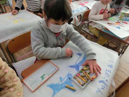 1年生が、5日(火)の図工の授業で、図工作品持ち帰り用の白い袋にクレヨンでお気に入りの絵を描きました。子どもたちは、思い思いに絵を描くことを楽しんでいました。その後、一年間学校に保管しておいた作品を、全て袋に入れて持ち帰りました。年度当初に子どもたちがかいた絵や文字が出てきて、どの子も、絵も文字もずいぶん上手になったね・・・とお互いに褒め合っていました。作品を見ると、その頃の子どもたちの様子が懐かしく思い出されました。一年間の子どもたちの成長が感じられる時間となりました。