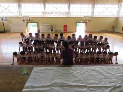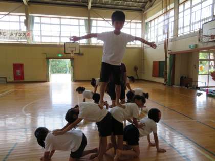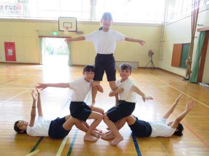 上学年の体育では、運動会の表現種目の練習に毎日取り組んでいます。だんだん表現の幅が広がってきました。お互いを信じて、声をかけ合って頑張っています。