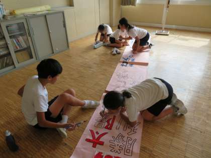 5年生が、各チームのスローガンの垂れ幕の色塗りを行いました。6年生が下書きをしてくれたものに、ポスターカラーなどで色を塗っていきました。中には、休み時間返上で頑張ってくれた子もいました。高学年としての自覚を感じました。