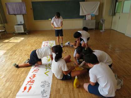 5年生☆各チームのスローガンの垂れ幕の色塗り