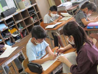 片浦小学校では、毎週水曜日の朝は、算数タイムです。6月23日(水)の朝、4年生は割り算の筆算の復習をしました。教務も教室に一緒に入り、わからないところがある児童については、担任と一緒に支援を行いました。教師に教えてもらってできるようになり、とても嬉しそうな様子の子がいました。
