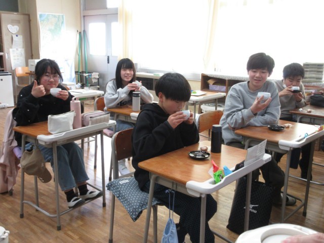 6年生もあとわずかで卒業です。今日は、校務用員さんのご厚意で「さくら茶」を用意していただき、お祝いしていただきました。