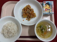 今日は今年度初めてのパンの日です。「一口サイズにちぎって食べてね。」の声かけに1年生も上手にちぎって食べていました。野菜のコンソメスープは具沢山で野菜の甘みがスープにしっかり出ていて、おかわりをしている子がたくさんいました。