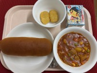 牛乳 黒パン ポークと豆のトマトシチュー チキンナゲット 今日は1・6年生がラ...