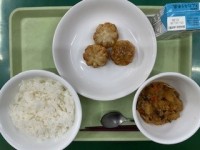 今日の献立は牛乳、きのこうどん、肉団子のケチャップ飴、ブルーベリーゼリーです。
