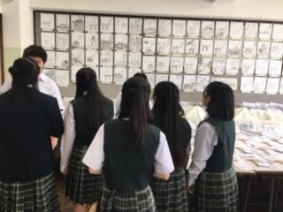 美術科は、自分の好きな色や形を見つけて作ったお面を展示しています。個性豊かなお面が並び、ひとりひとりの工夫と表現力が光っています。また、修学旅行(京都・広島)での思い出を水墨画に表現しています。伝統文化を感じさせる作品が多かったです。。