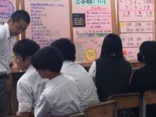 3年総合は修学旅行で行った広島と京都についての学びや感じたことを、それぞれの生徒が新聞にまとめていました。修学旅行の思い出や体験を鮮やかに伝える内容になっています。それぞれの生徒が異なるまとめ方をしているため、多様な視点の資料を見ることができました。