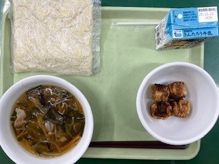 今日の献立は牛乳、サンマーメン、揚げシュウマイです。