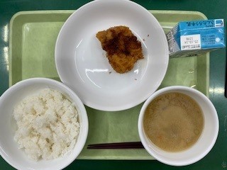 今日の献立は牛乳、ご飯、チキンカツ、さつま汁です。