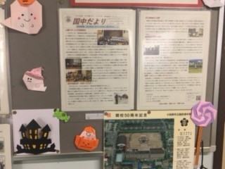 カボチャのおばけやコウモリ、魔女のお城など、季節感あふれる折り紙が並び、廊下を歩く生徒たちも「かわいい!」「すごい!」と足を止めて見入っています。
