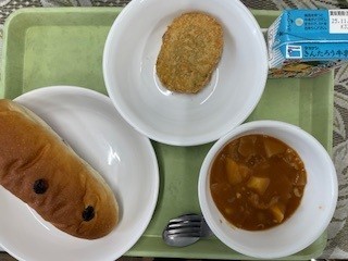 今日の献立は牛乳、ぶどうパン、豚肉のトマト煮、南瓜のコロッケです。