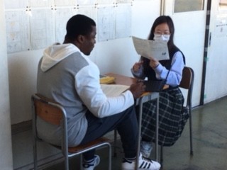 生徒たちは事前にスポットの特徴や魅力を英語でまとめ、分かりやすく説明する工夫をしました。プレゼンは1対1で行うため、最初は少し緊張した様子も見られましたが、ALTの先生の笑顔やリアクションに励まされ、次第に自信をもって話す姿が印象的でした。