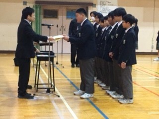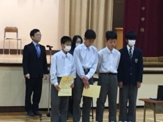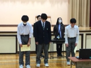最初び表彰が行われました。今回表彰されたのは、社会科、美術科、科学部、バドミントン部、軟式野球部、サッカー部、陸上競技部でした。それぞれの活躍に、画面越しでも大きな拍手が送られました。