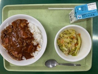 今日の献立は牛乳、ハヤシライス、ハムと野菜のソテーです。