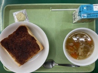 今日の献立は牛乳、ココアトースト、ABCスープ、チーズです。