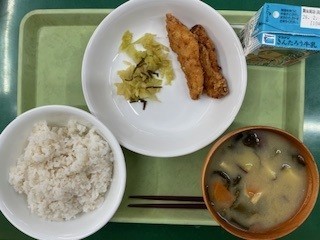 今日の献立は牛乳、麦入りご飯、さばふぐのから揚げ、神奈川わかめの味噌汁、キャベツの塩昆布炒めです。