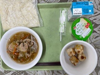 今日の献立は牛乳、梅丸ラーメン、コーンシューマイ、ヨーグルトです。