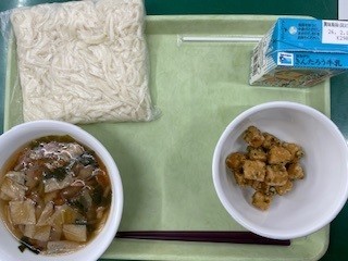今日の献立は牛乳、ゆで麺、湯葉入りうどん、高野豆腐のこはく揚げです。