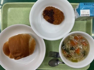 今日の献立は牛乳、米粉ロールパン、メンチカツ、ABCスープです。