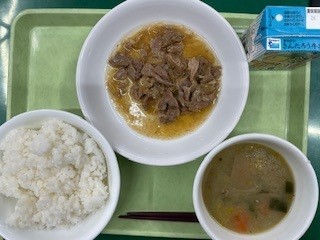 今日の献立は牛乳、ご飯、豚肉のしょうがいため、チゲ風みそ汁です。