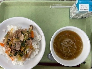 今日の献立は牛乳、豚キムチ丼、ビーフンスープです。