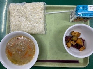 今日の献立は牛乳、味噌ラーメン、大学いもです。