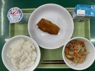 今日の献立は牛乳、ごはん、いかのさらさ揚げ、野菜炒め、ヨーグルトです。