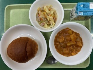今日の献立は牛乳、ロールパン、豚肉のトマト煮、イタリアンソテーです。