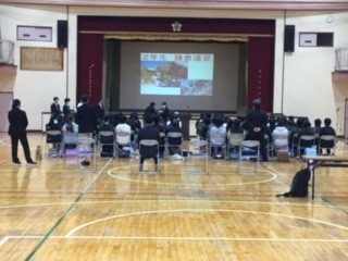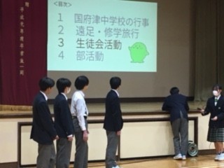 その後、体育館に移動して、生徒会本部役員による中学校生活の説明を行いました。生徒会の先輩たちが、学校生活の流れや部活動、年間行事などを分かりやすく紹介し、小学生の皆さんも興味深く耳を傾けていました。4月からの新しい仲間を楽しみにしています。