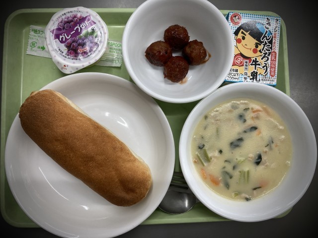 今日の献立 牛乳、米粉パン、豆乳シチュー、ミートボール、グレープゼリー