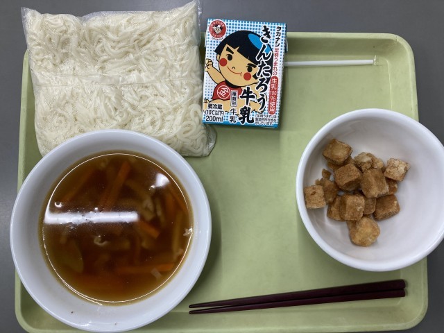 今日の献立 牛乳、こぎつねうどん、高野豆腐の唐揚げ