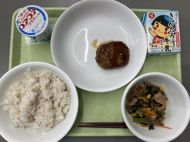 今日の献立 牛乳、麦入りご飯、照り焼きハンバーグ、青菜とこんにゃくの和風炒め、ヨーグルト