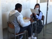 視聴後は、「火災と煙についてのクイズ」を行いました。難しい問題に頭を悩ませる生徒も…。