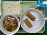 今日の献立は、牛乳、麦入りご飯、チンジャオロース、ビーフンスープです。