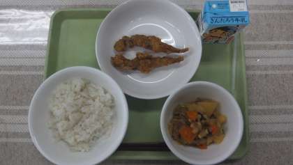 今日の献立は、ししゃもフライ、肉じゃが、麦入りご飯、牛乳でした。