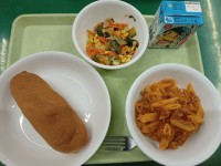 今日の献立は、七草細うどん、こんにゃくのピリ辛炒め、牛乳でした。神奈川県産は豚肉・牛乳、小田原産はにんじん・大根・かぶ・白菜・さつま揚げです。今日は小田原産の食材をたくさんいただきました。ごちそうさまでした。