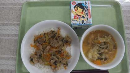今日の献立は、ビビンバ丼、チゲ風汁、牛乳でした。神奈川県産は牛乳、小田原産は玉ねぎです。