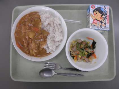 今日の献立は、牛乳、カレーライス、ウインナーと野菜のソテーでした。神奈川県産は牛乳です。小田原産は米、にんじんです。