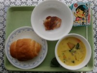黒パン ハンバーグ 青のり粉ふきいも ABCスープ 牛乳