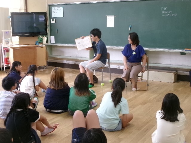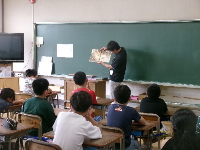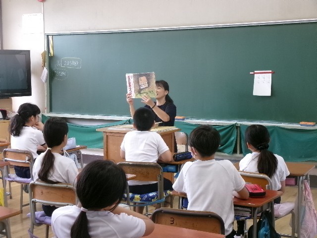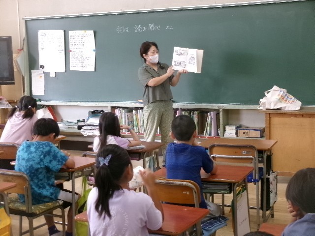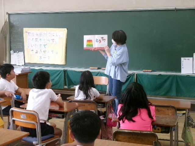 3・4年生は、机を教室の後ろに下げて前に集まって聞いているクラスがあったり、紙芝居を読んでくださるクラスがあったり…といろいろ。